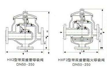 HXF2带双接管呼吸阀根据国家标准《石油化工企业设计防火规范》(GB50160-92)之规定:甲、乙类液体的固定顶罐,应设阻火器和呼吸阀。可见呼吸阀、阻火器是储罐不可缺少的安全设施。它不仅能维持储罐气压平衡,确保储罐在超压或真空时免遭破坏,且能减少罐内介质的挥发和损耗。上海济南俊豪家庭艺术设计有限公司厂生产的呼吸阀,具有结构紧凑、通气量大、泄漏量小、密封性能好等特点。