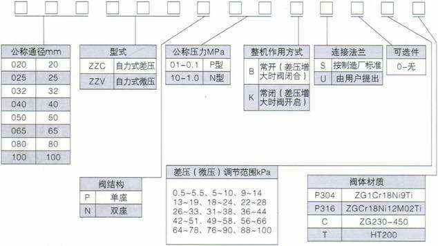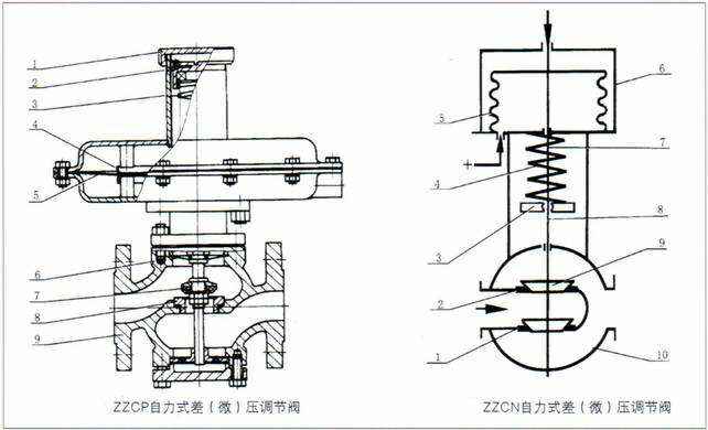 差(微)压调节阀有B型和K型两种。B型阀阀芯初始位置常开,差(微)压增大时闭合。K型阀阀芯初始位置常闭,差(微)压增大时开启。